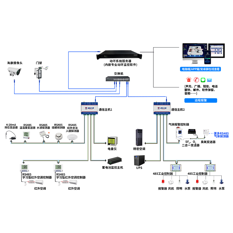 機(jī)房動(dòng)力環(huán)境監(jiān)控系統(tǒng)是一個(gè)綜合利用計(jì)算機(jī)網(wǎng)絡(luò)技術(shù)、數(shù)據(jù)庫技術(shù)、通信技術(shù)、自動(dòng)控制技術(shù)、新型傳感技術(shù)等搭建的監(jiān)控系統(tǒng),系統(tǒng)包含溫濕度監(jiān)控子系統(tǒng)、漏水監(jiān)測子系統(tǒng)、煙感探測子系統(tǒng)、斷電檢測子系統(tǒng)、噪聲監(jiān)測子系統(tǒng)等十余個(gè)子系統(tǒng),能夠?qū)崿F(xiàn)動(dòng)力環(huán)境監(jiān)控、數(shù)據(jù)信息傳輸、平臺(tái)遠(yuǎn)程管控、門禁安全防護(hù)、安卓屏現(xiàn)場查看等功能。