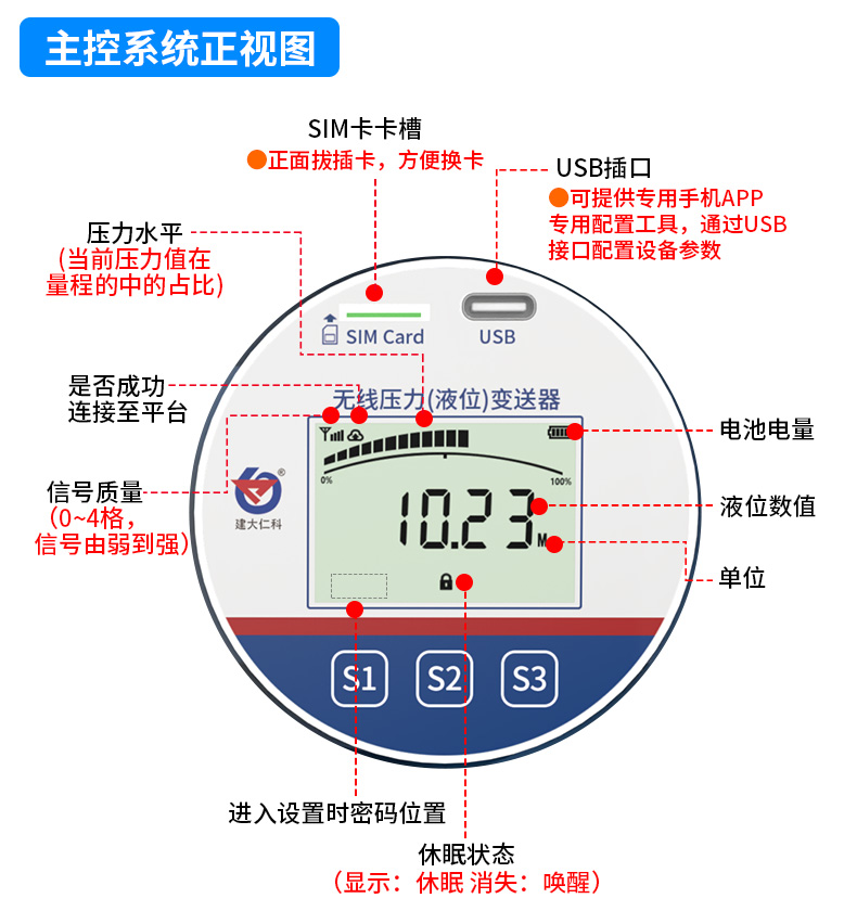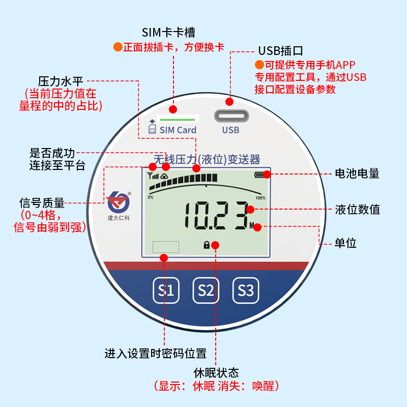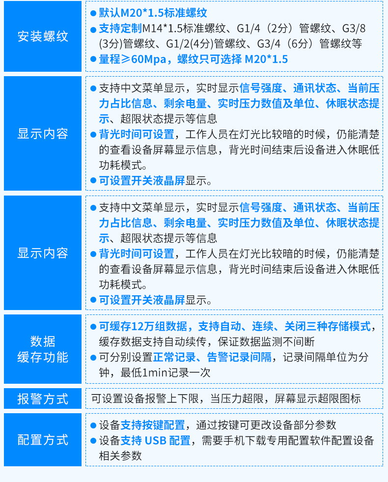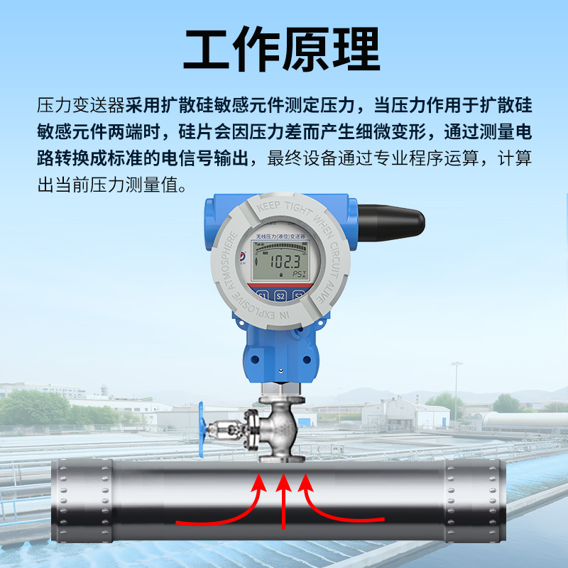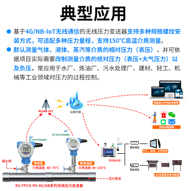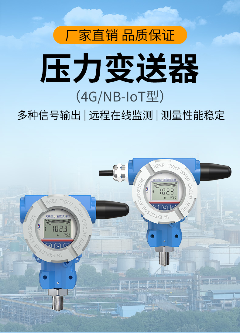 基于4G/NB-loT無線通信的無線壓力變送器由“壓鑄鋁合金外殼、主控系統(tǒng)、液晶顯示屏、測量電路、機(jī)械連接件、擴(kuò)散硅敏感元件”等核心部件組成,支持多種規(guī)格螺紋安裝方式,可適配多種壓力量程,支持150C高溫介質(zhì)測量。默認(rèn)測量“氣體、液體、蒸汽”等介質(zhì)的相對(duì)壓力(表壓),依據(jù)項(xiàng)目實(shí)際需要改制測量介質(zhì)的絕對(duì)壓力(表壓+大氣壓力)以及負(fù)壓。