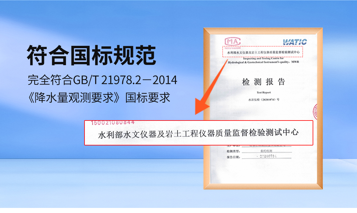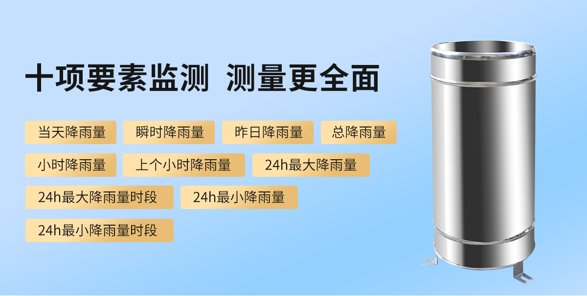 翻斗式雨量計完全符合GB/T21978.2一2014《降水量觀測要求》國標要求,可附帶水利部水文儀器及巖土工程儀器質(zhì)量監(jiān)督檢驗測試中心的檢測報告??刹杉矔r雨量、當天雨量、昨日雨量、累計雨量等十項雨量數(shù)據(jù),支持多種信號輸出方式,全系列產(chǎn)品均支持個性化定制。