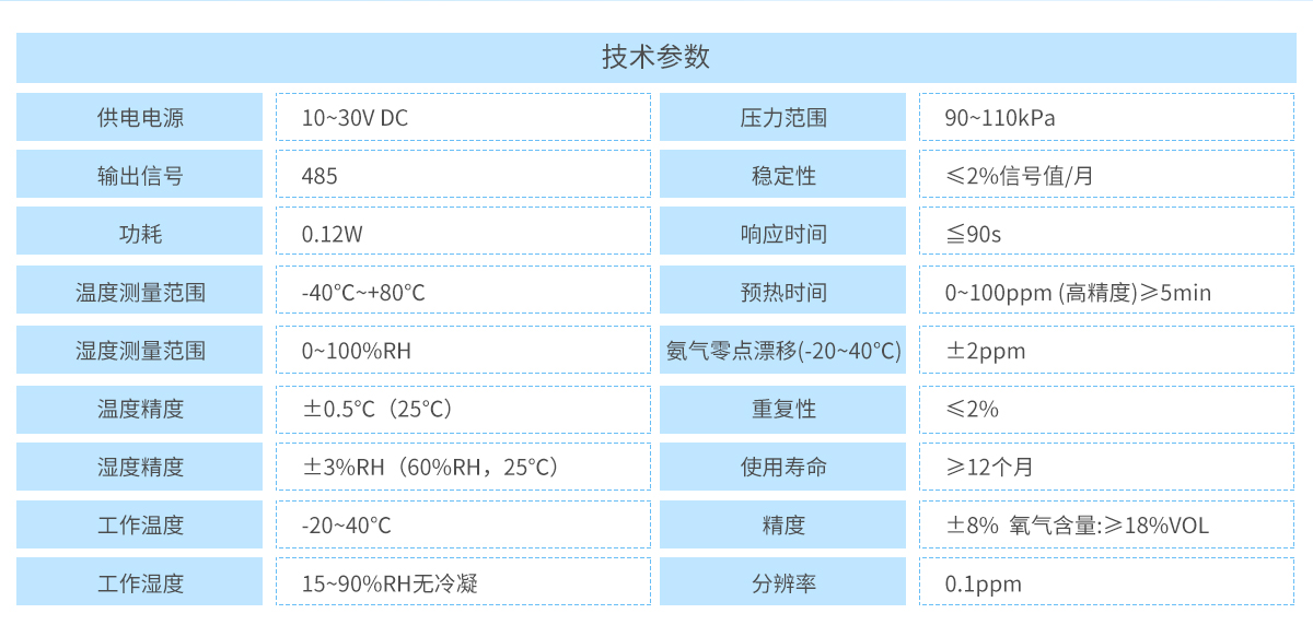 | 氨氣零點(diǎn)漂移(-20~40℃) | 0~50ppm(高精度) ≤±2ppm |