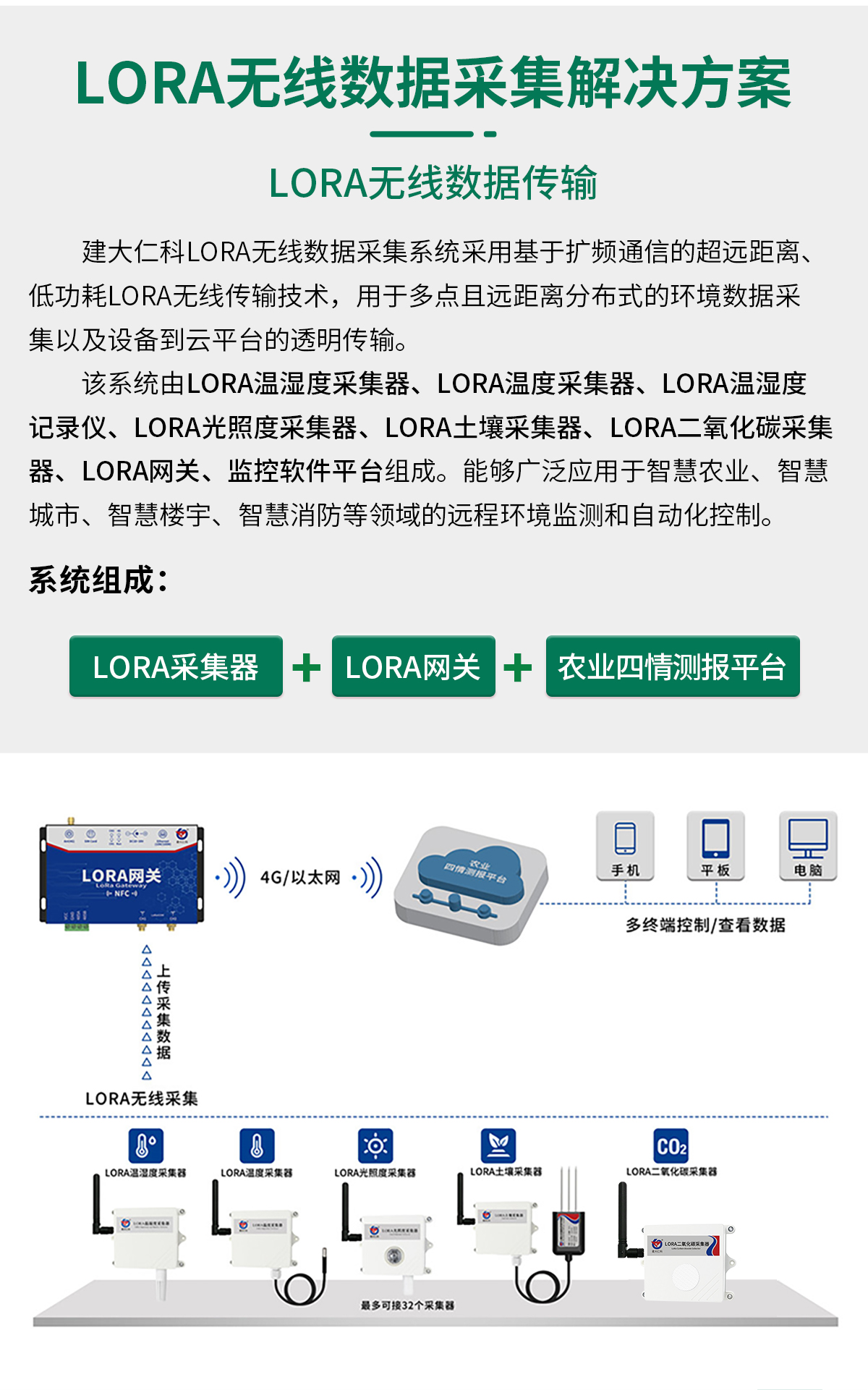 LoRa無線數(shù)據(jù)采集系統(tǒng)采用基于擴頻通信的超遠距離、低功耗LoRa無線傳輸技術(shù),用于多點且遠距離分布式的環(huán)境數(shù)據(jù)采集以及設(shè)備到云平臺的透明傳輸。廣泛適用于農(nóng)業(yè)大田、果園、藥園、公園、園林此類具有供電難度大,面積廣袤,布線成本高,維護成本高等特點的使用環(huán)境。